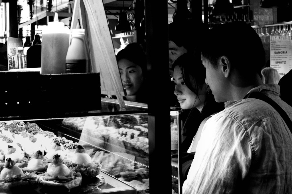 Hoy, mientras caminaba entre ellos, acompañando a otros que compartían este afán por capturar lo que a menudo pasa desapercibido, sentí que todos llevábamos esa búsqueda silenciosa, casi secreta. No basta con mirar; es necesario aprender a ver. Esas dos personas, entre tantas, se distinguían por algo más que su presencia. Ellas, como yo, miraban hacia otro lado, hacia aquello que la mayoría ignora. Porque para hacer street photography no basta con estar en la calle; hay que saber leer entre las sombras, entre los gestos fugaces, las pequeñas escenas que el tiempo deja atrás sin detenerse.